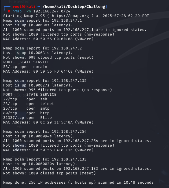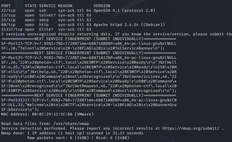 nmap -p 22,23,25,80,31337 -sV 192.168.247.135 -vv