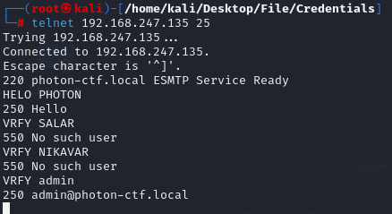 خب به دستورات دقت کنیم، وقتی وریفای میزنیم کاملا داره پشتیبانی میکنه از این دستور و حتی کاربری رو هم پیدا کرد، 550 یعنی کاربری وجود نداشت با چنین نامی ولی 250 یعنی این کاربر وجود داشت و نامه دامنه رو هم یا آدرس کامل ایمیل اون فرد رو هم ارسال کرد، پس میدانیم که ابزار حالا به دلیلی صحیح کار نکرده بود، پس من رفتم سراغ یک ابزار دیگر که به صورت پیش فرض در کالی نصب هم هست.