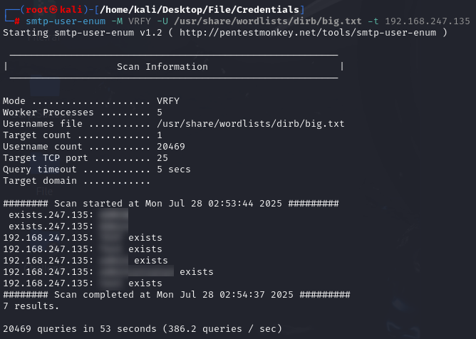 خب پس از استفاده از ابزار smtp-user-enum و دادن ورد لیست با سویچ U و T برای تارگت یا مقصد و همینطور M برای استفاده از متد یا دستور وریفای (مختص سرویس اس ام تی پی) من متوجه شدم که 7 کاربر وجود دارد ولی از اونجایی که کوچک بزرگ فرقی ندارد برای میل سرور، پس تعداد کاربرهای این سرویس برابر با 3 عدد هست، که این فلگ بعدی ما هست.